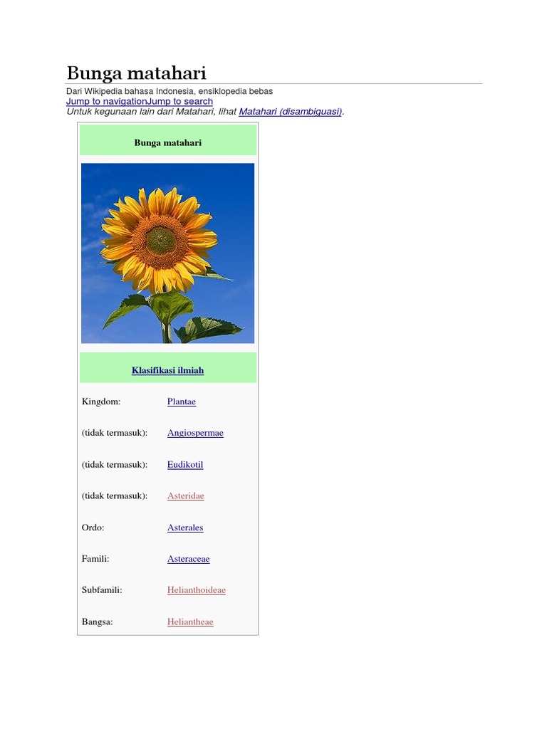 Bunga Matahari Wikipedia / Asterales Wikipedia : Except for three south american species, the species of helianthus are native to north america and central america.the common names sunflower and common sunflower typically refer to the popular annual species helianthus annuus, whose.. Bunga matahari (judul asli, dalam bahasa prancis: Except for three south american species, the species of helianthus are native to north america and central america.the common names sunflower and common sunflower typically refer to the popular annual species helianthus annuus, whose. Besar, biasanya berwarna kuning terang, dengan kepala bunga yang besar (diameter bisa mencapai 30 cm). Badan pengembangan dan pembinaan bahasa, kementerian pendidikan dan kebudayaan republik indonesia. Helianthus annuus, the common sunflower, is a large annual forb of the genus helianthus grown as a crop for its edible oil and edible fruits.